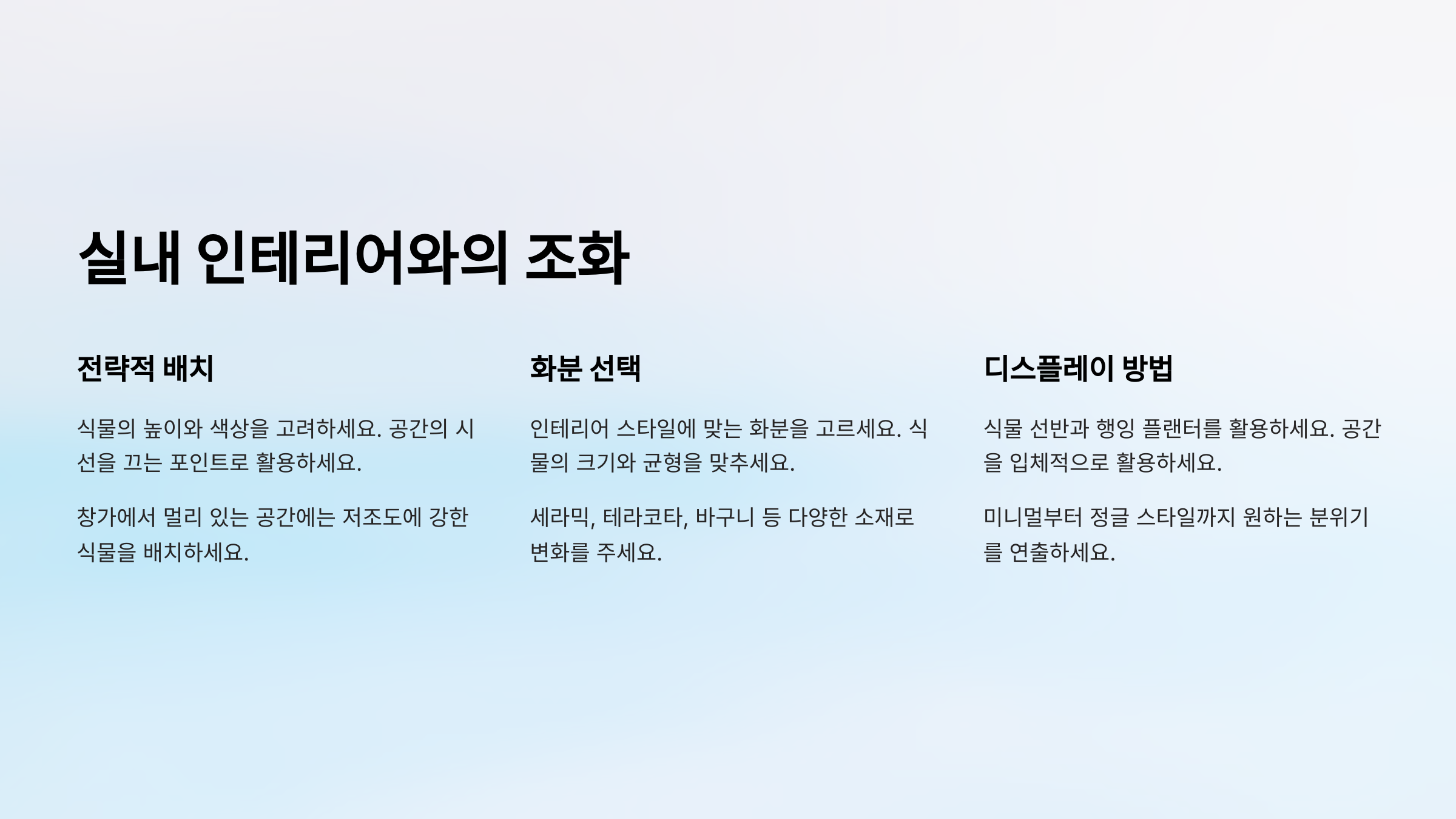 이제부터 본격적으로 햇빛 없는 환경에서도 푸릇푸릇한 공간을 만들 수 있는 비법을 공개할게요! 🪴
