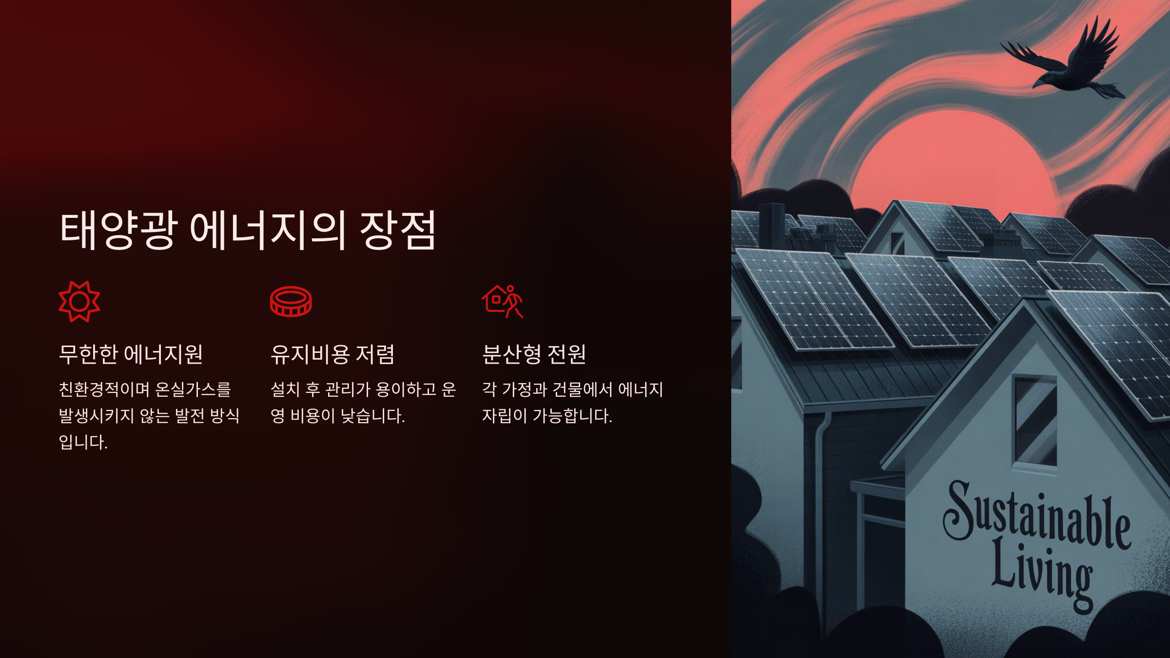 | 단점 | 날씨 의존, 야간 발전 불가, 초기 비용 부담, 공간 필요 |