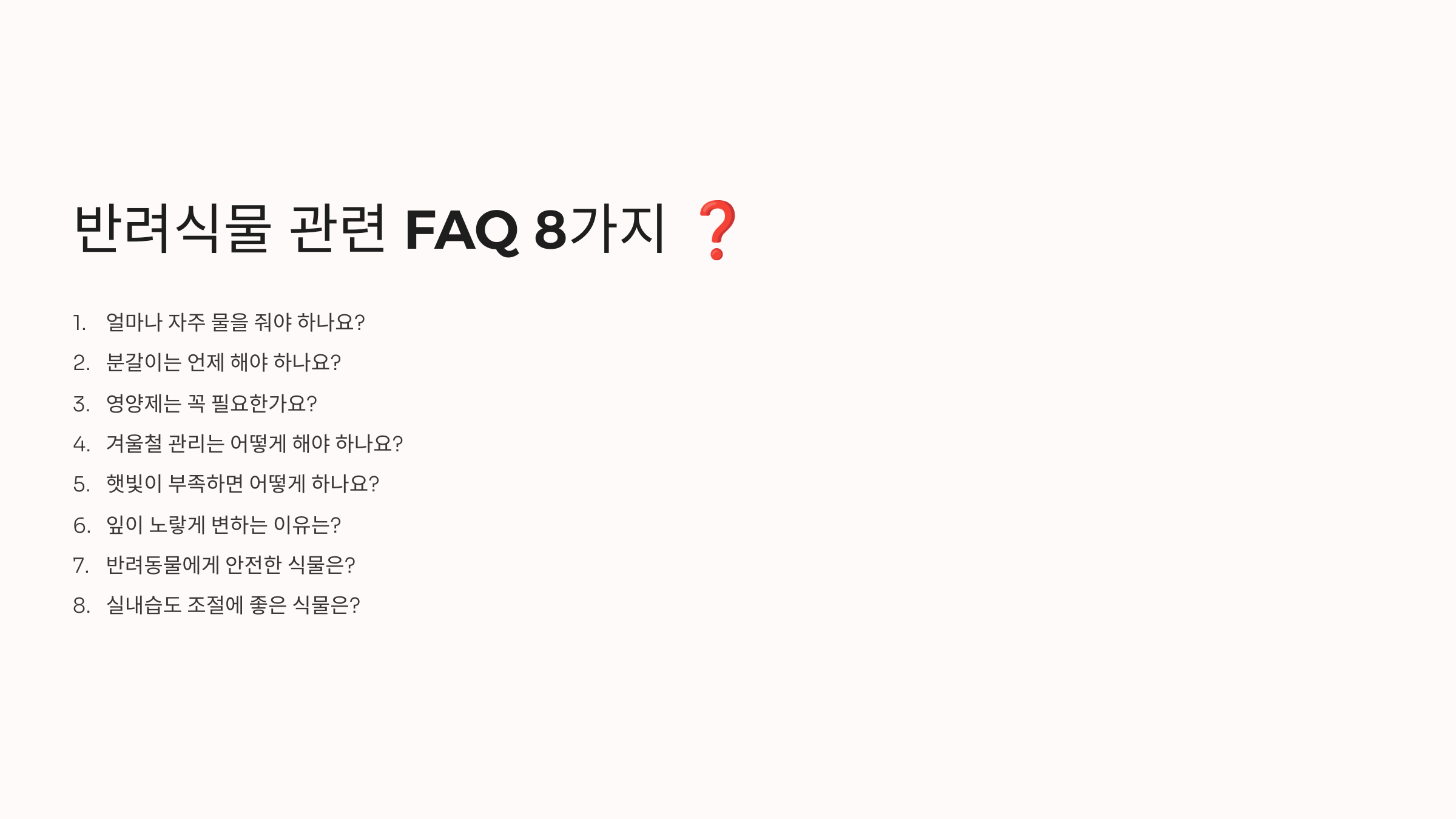 | 1. 물 주기는 적당히! | 물을 너무 자주 주면 뿌리가 썩어요. 흙이 마른 후에만 주세요. |