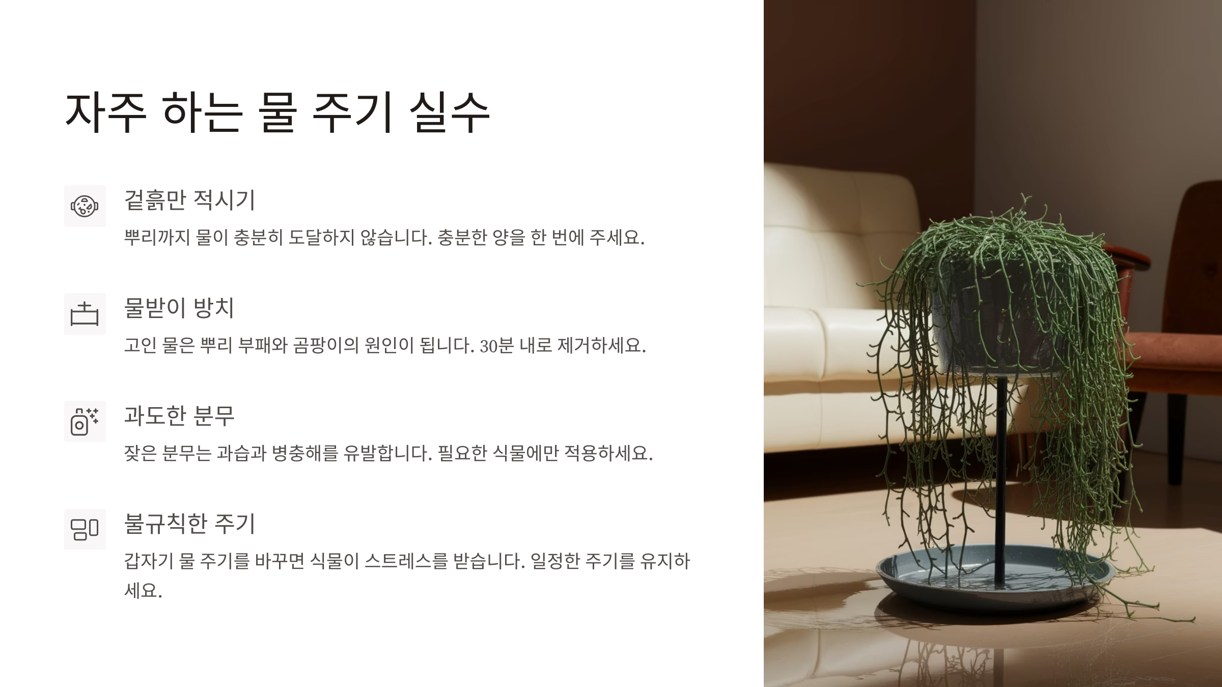 | 💧 한 번에 조금씩 줌 | 뿌리까지 물이 닿지 않음 | 한 번 줄 때 흙 전체가 적시도록 주기 |