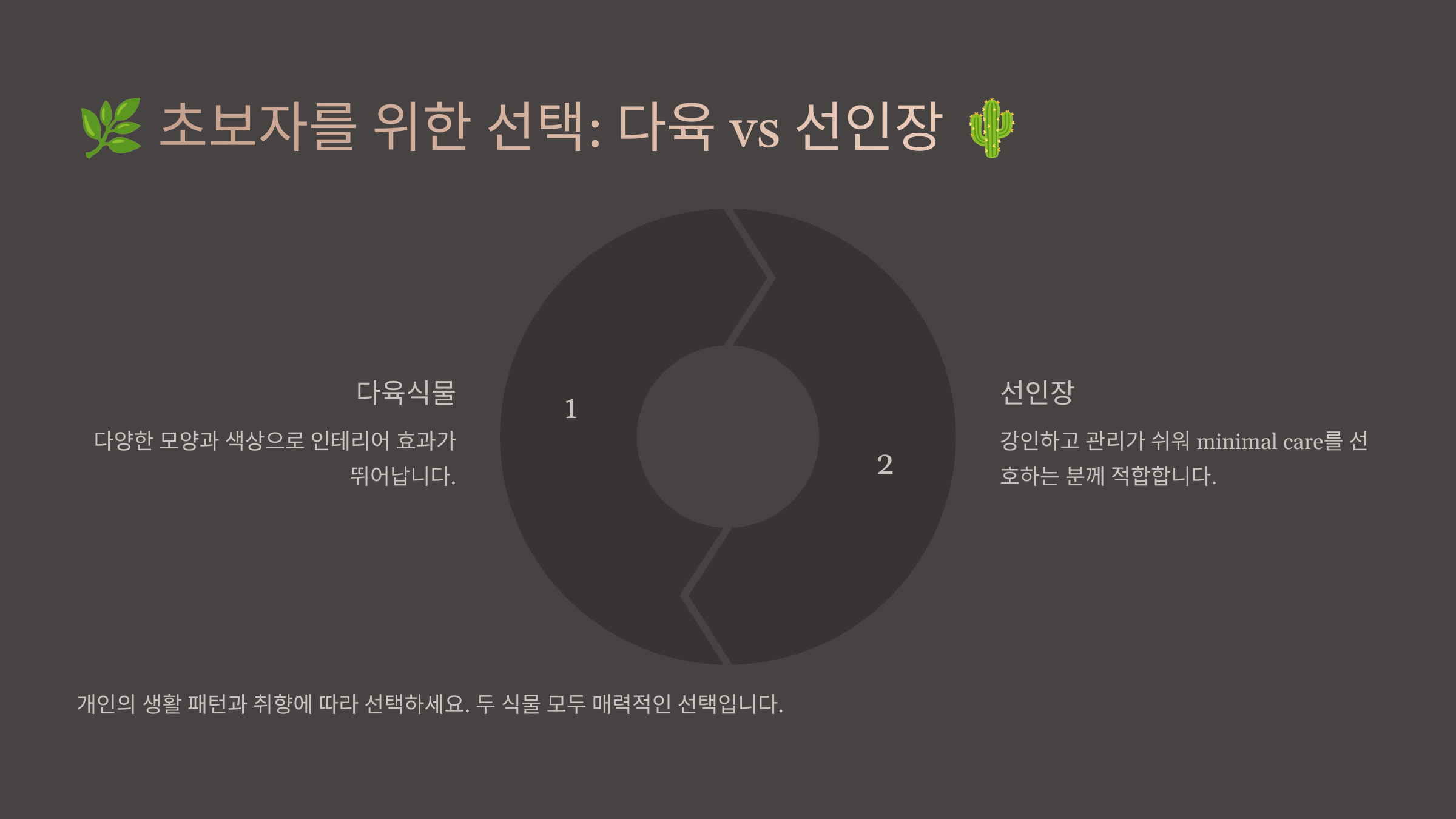 이제까지 다육식물과 선인장의 특징을 비교해봤어요! 그렇다면, 반려식물을 처음 키우는 초보자에게 더 적합한 식물은 무엇일까요? 🤔