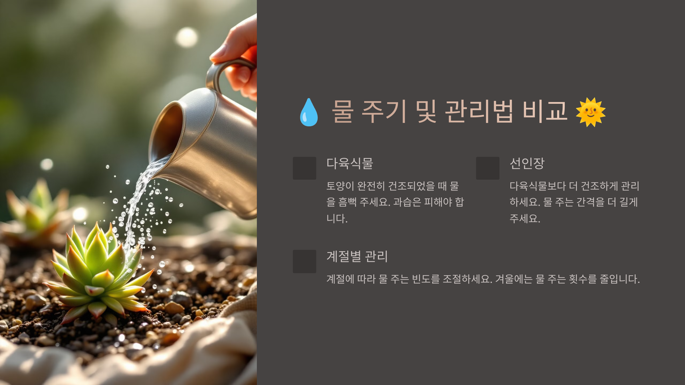 위 표를 보면 다육식물은 상대적으로 물을 더 자주 줘야 하고, 선인장은 훨씬 덜 줘도 된다는 걸 알 수 있어요. 특히 겨울철에는 다육식물도 물을 거의 주지 않는 것이 중요해요.