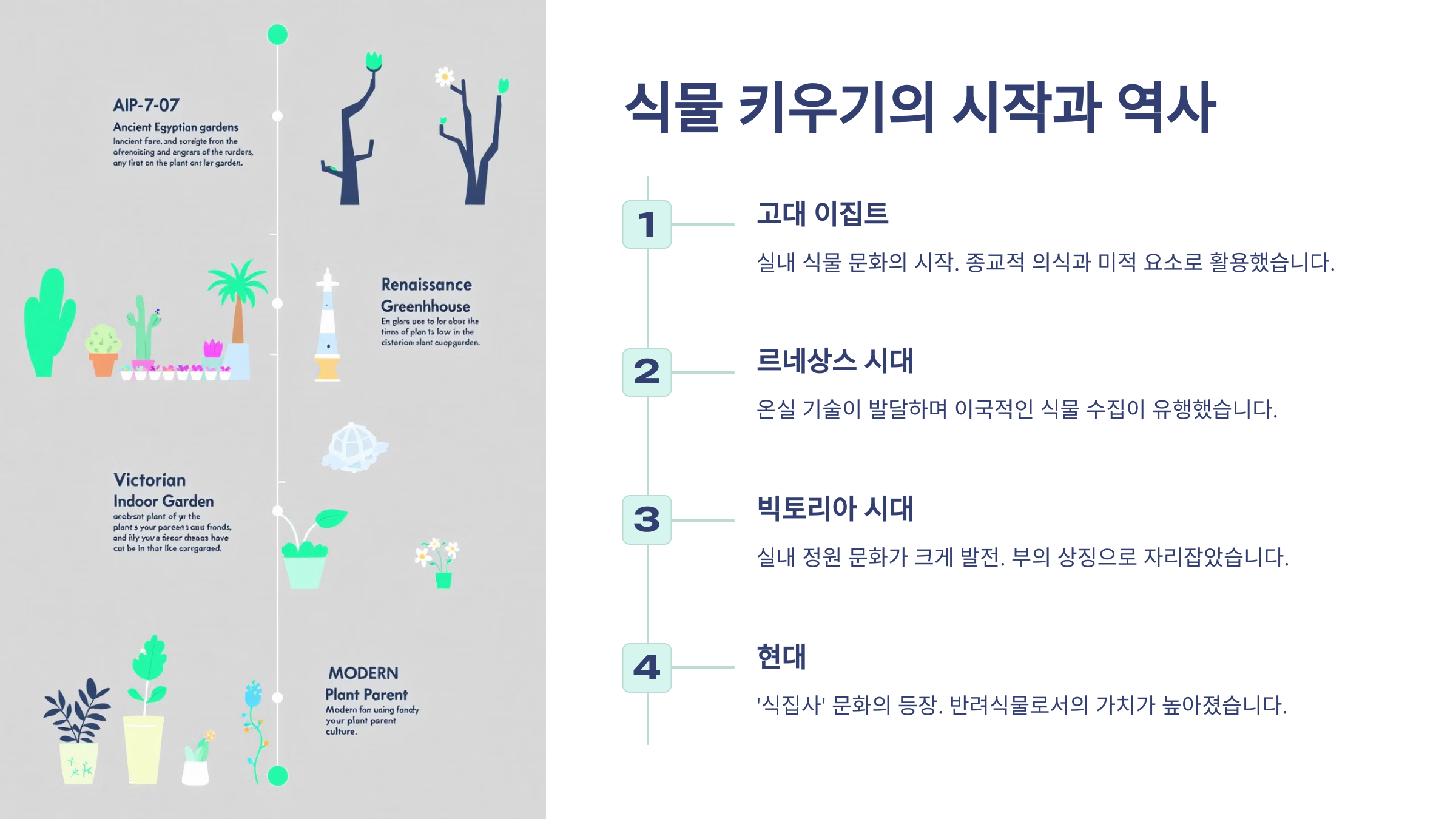 이처럼 시대에 따라 식물과의 관계는 다양하게 변화했어요. 과거에는 생존과 약용을 위해, 지금은 정서적 안정과 환경 개선을 위해 키우게 된 거죠. 🌼