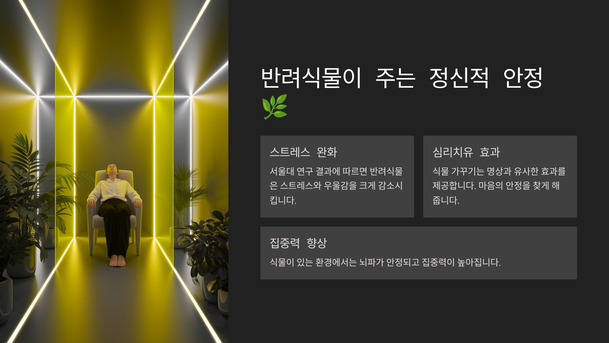 | 집중력 향상 | 식물이 있는 환경에서 공부나 업무의 효율성이 증가 |