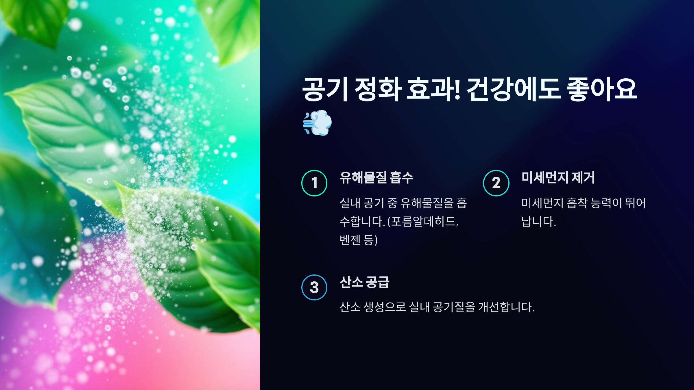 | 스트레스 완화 | 녹색 식물이 심리적 안정감을 높이고 긴장을 풀어줘요. |