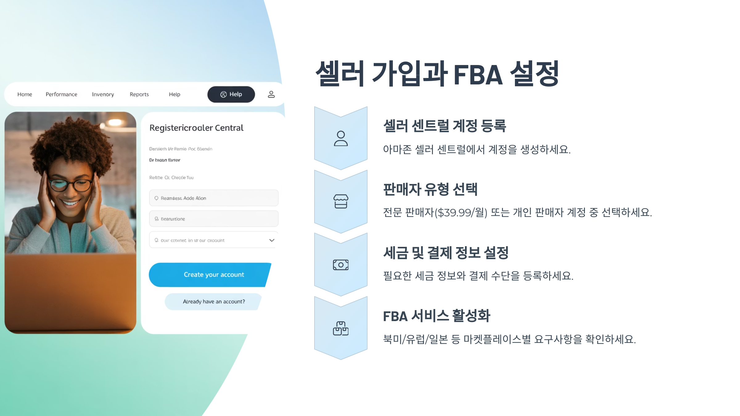 📥 가입 절차 1⃣ [sellercentral.amazon.com](https://sellercentral.amazon.com) 접속 2⃣ 이메일 인증 후 판매자 계정 등록 3⃣ 사업자 등록번호 or 개인 신분증 입력 4⃣ 통장 & 카드 등록 → FBA 선택 5⃣ 계정 승인 → 상품 등록 가능!