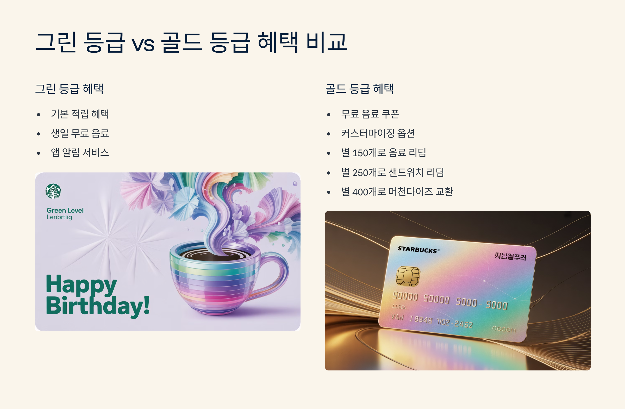 반면, ‘골드 등급’이 되면 별 12개마다 무료 음료 쿠폰이 자동 발급되고, 생일 쿠폰 1장 + 시즌 한정 음료 무료 시음 이벤트 + 전용 굿즈 예약 참여권 등의 프리미엄 혜택이 생겨요.