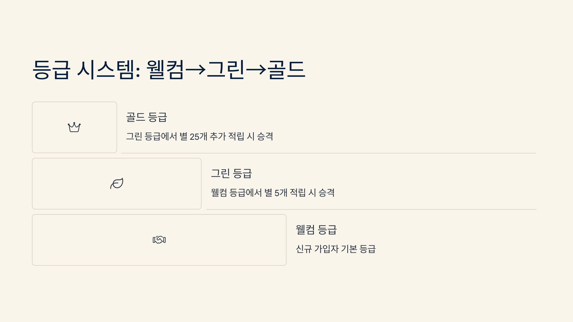 리워드 멤버십은 기본적으로 ‘그린 등급’으로 시작해요. 이때는 단순히 별 적립만 가능하고, 쿠폰이나 특별 혜택은 제한적이에요. 그린 등급은 ‘리워드 준비 단계’라고 볼 수 있어요 🟢